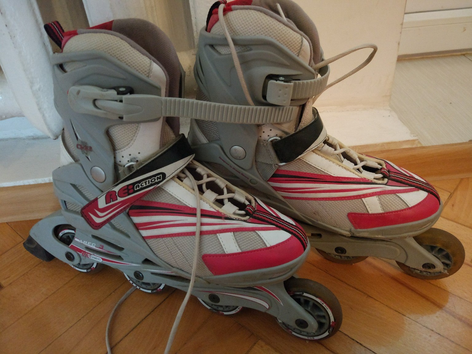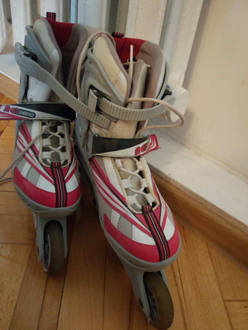 Спортивные 4 колеса из каучука (отличное скольжение+бесшумность) Тех.характеристики: Материал: алюминий Есть тормоз Диаметр колеса 80 мм Жесткость колеса 80 а Тип фиксации: бакля с эффектом памяти,пяточный размер ,шнуровка Тип ботинка: мягкий Цвет: серый+белый+малиновый Размер:38-40 Очень хорошее состояние. В цену не входит стоимость за отправку в другой город.